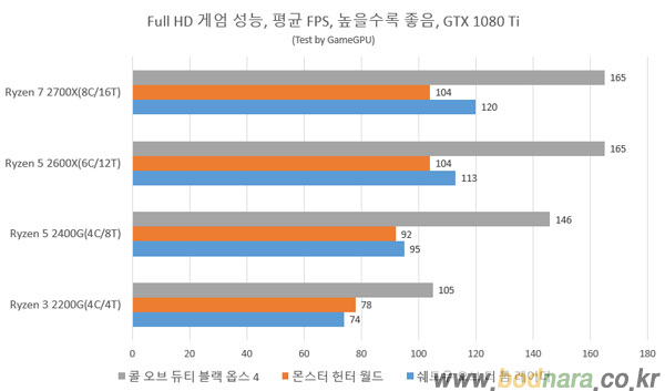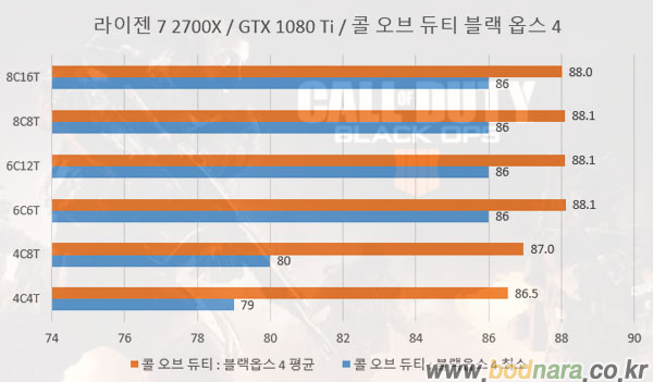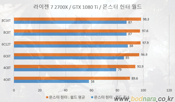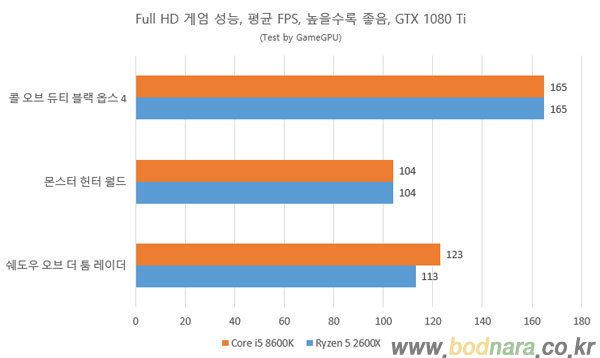 위 멀티코어 활용도를 체크하는데 쓰인 게임 3종에 대해, GameGPU에서 AMD와 인텔의 최신 6코어 CPU인 라이젠 5 2600X와 코어 i5 8600K를 테스트한 자료가 있는데, 이들 결과를 보면 두 CPU의 평균 성능은 콜 오브 듀티 블랙 옵스 4와 몬스터 헌터 월드에서 동일한 것을 알 수 있다.
