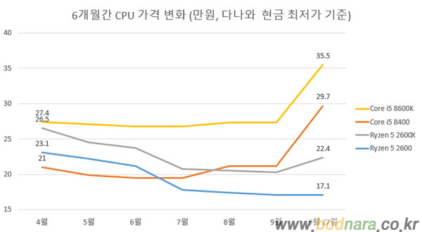 일반적인 상황이었다면 가격도 비슷하기에 게이머가 선호하는 제품을 선택하면 되겠지만, 한가지 짚고 넘어갈 부분이 있다면 2018년 9월 말 현재 정상적이라고 보기 어려운 인텔 CPU 가격의 고공 행진 상황으로, 동급 제품간 가격 차이가 약 10만원 이상 차이난다.