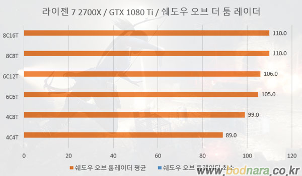 전체적인 게임 성능은 인텔 계열 CPU가 동급의 AMD 라이젠보다 높은 것으로 알려진 것을 감안하면 색다른 결과지만, 쉐도우 오브 더 툼 레이더에서는 인텔 코어 i5 8600K가 더 뛰어난 성능을 보여주면서 여전히 게임에서 인텔 CPU가 강세임을 보였다.