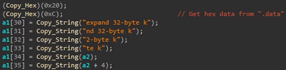프로그램은 실행 시 .data 영역에서 “!!!CONFIG!!!”와 “!!!PASSWORD!!!” 문자열의 존재 여부를 확인하며, 두 문자열이 모두 존재하지 않을 경우 .data 영역의 상위 0x30바이트를 추출해 특정 문자열과 결합한 값을 활용해 ChaCha20 알고리즘을 구성한다. 이를 기반으로 .data 영역의 나머지 암호화된 데이터를 복호화한다.