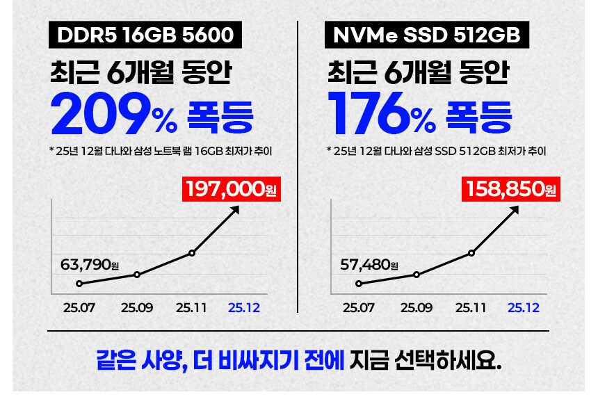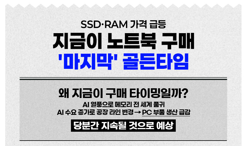 SSD와 RAM 가격이 단기간에 하락할 가능성이 낮고, 중장기적으로 추가 상승 가능성까지 거론되는 상황에서 노트북 구매 시기를 무작정 미루는 것은 오히려 부담이 될 수 있습니다.