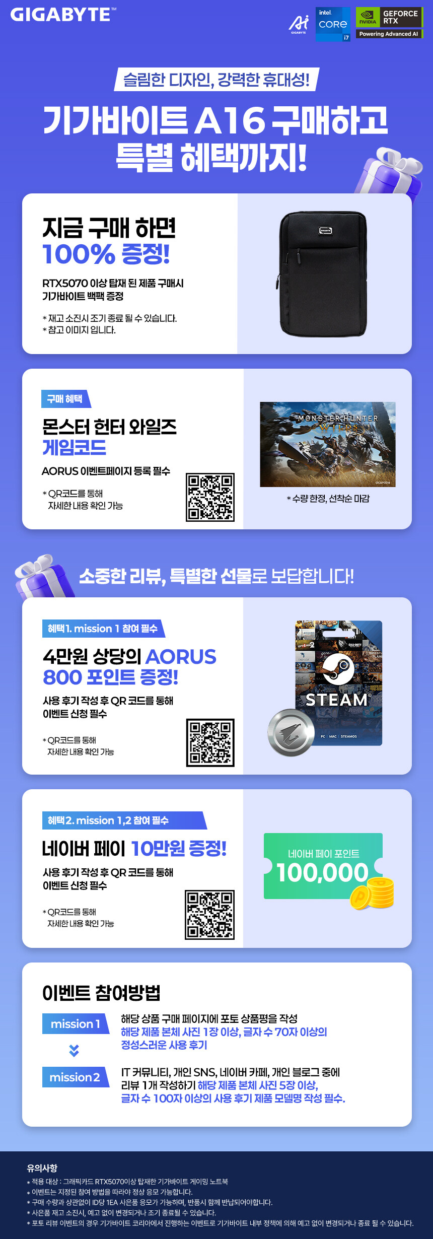 모델에 따라 어로스 마우스, 어로스 후드, 기가바이트 백팩 등 노트북과 함께 활용하기 좋은 구성으로 준비되어 있어 별도로 주변기기를 구매해야 하는 부담을 줄여줍니다.