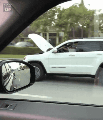 | 보닛이 열린채 달리는 차 |