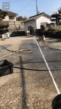 물줄기를 따라다니는 멍멍이가 즐거워 보입니다.