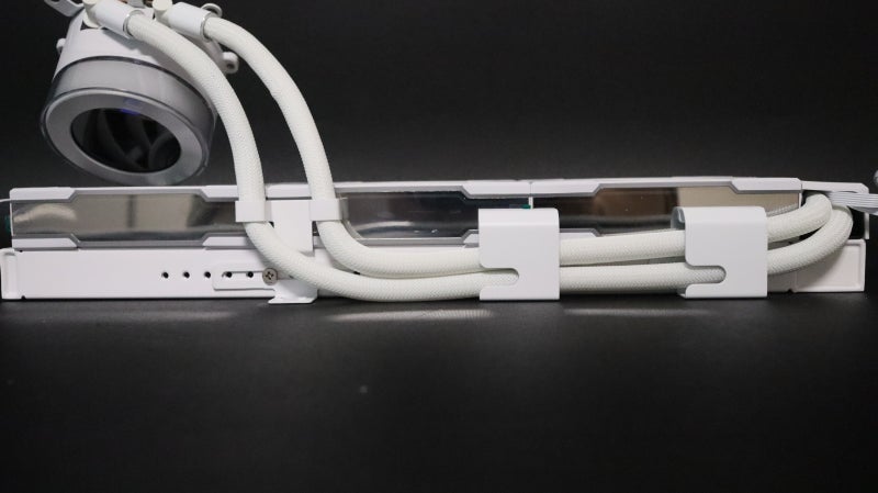 라디에이터의 측면으로 가지런히 정리된 튜브들은 라디에이터에 견고하게 부착된 3 개의 스틸 브래킷을 통해 라디에이터의 중심부까지 정렬이 이어지고 그 공간에서 바로 펌프를 향해 튜브가 노출되기 시작합니다.
