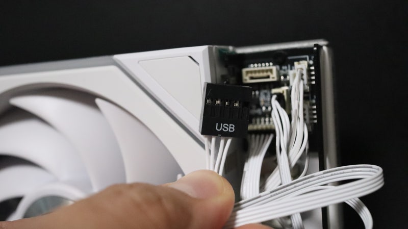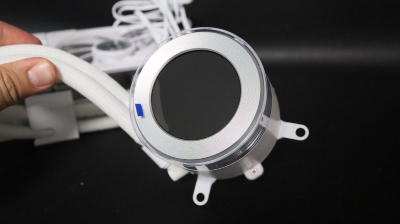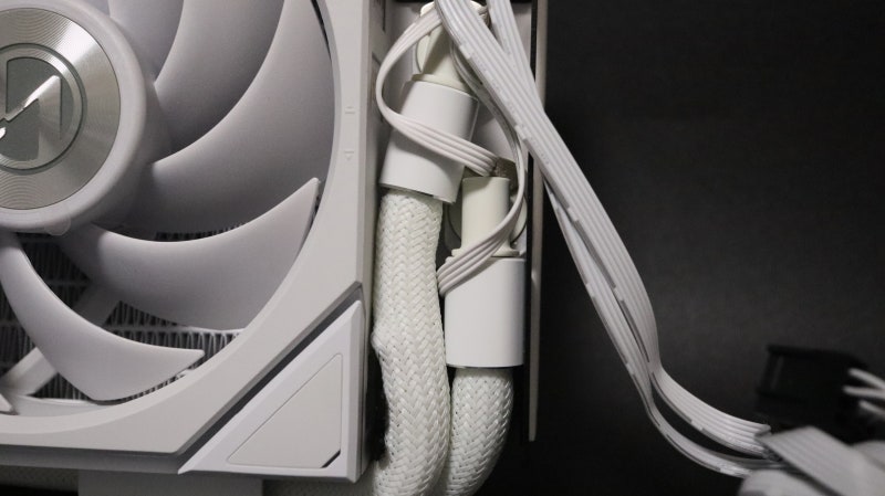 실제 펌프는 CPU에 가까이 있지만 튜브의 코팅 외피 내부로 배선이 숨겨져 있으며 이 곳 까지 연결되죠. 여기서 유일하게 USB 커넥터는 제거하는것이 가능한데, 이 커넥터를 메인보드와 연결하지 않으면 LCD화면에 사진 또는 영상을 넣는 등 고급 커스터마이징이 불가능합니다.