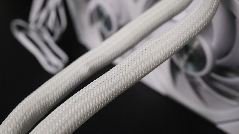 튜브는 일반적인 수랭쿨러들 대비 살짝 얇은 지름을 갖고있으며 고급스런 직조 마감이 되어 있습니다. 이 코팅 아래로 펌프용 배선이 숨겨져 있죠.