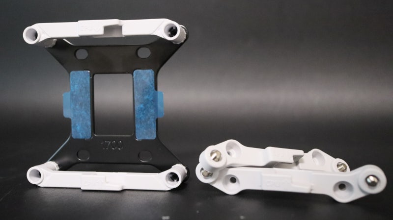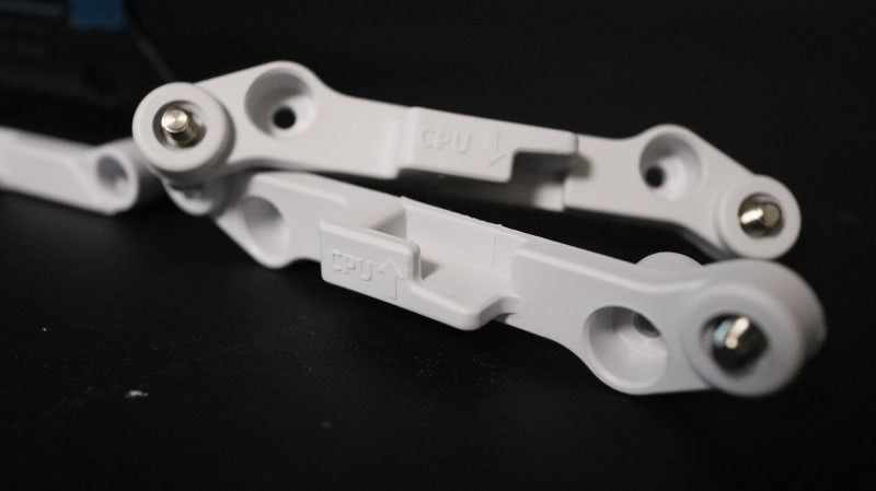 좌측이 인텔, 우측이 AMD용 워터펌프 장착 브라켓인데 둘 다 브라켓 가운데에 걸쇠 형태의 구조가 적용된 것이 눈에 띄는 특징입니다.