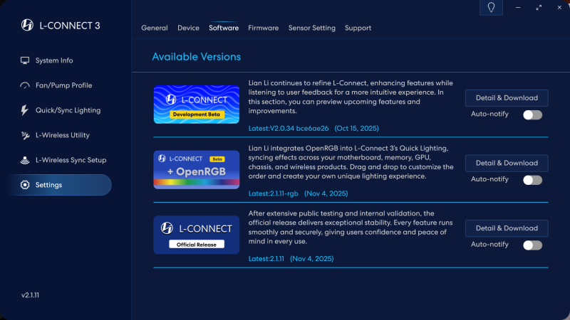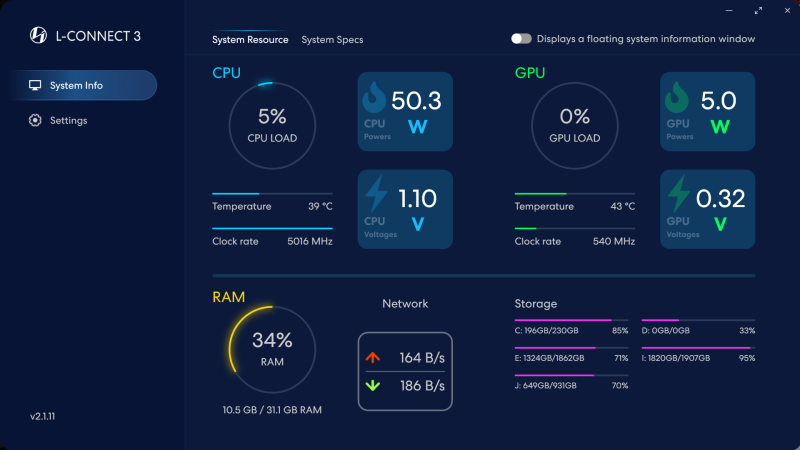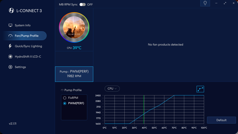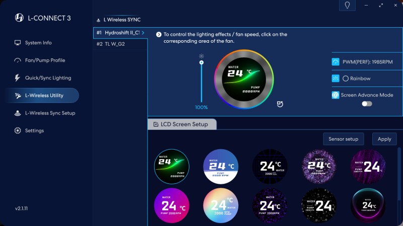 위 이미지는 L-Connect3 소프트웨어에서 모든 연결 (USB 2.0 / 무선 동글)이 진행된 상태에서의 모습입니다. 펌프 유닛과 쿨링팬에 대한 모든 기능과 모니터링이 활성화 된 상태를 볼 수 있습니다.