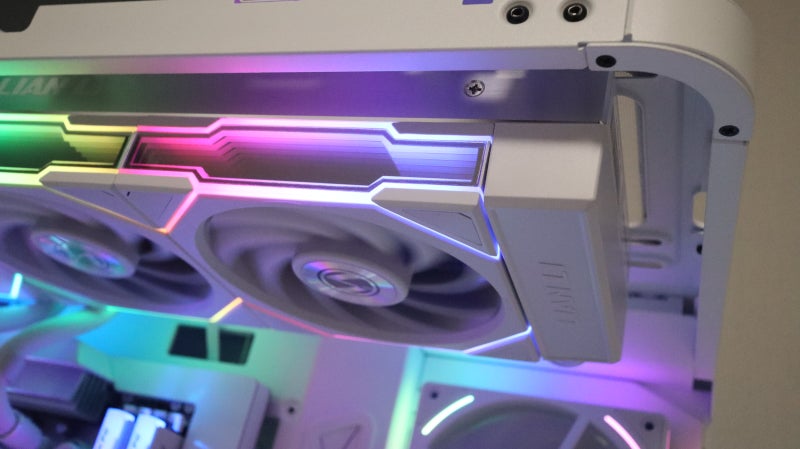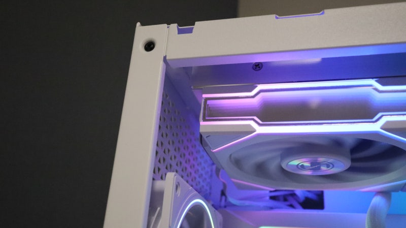 쿨링팬의 측면은 인피니티 미러가, 블레이드 방향으로는 모서리를 따라 직선적인 LED 바가 적용되어 충분한 조명 효과를 제공합니다.