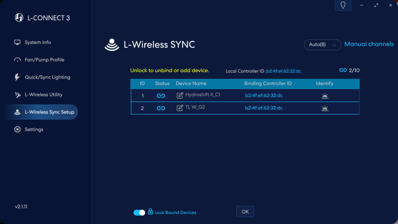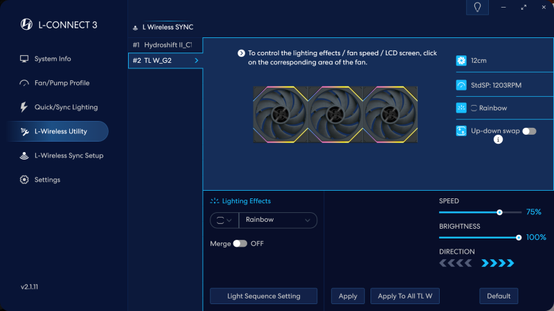 다만 이 경우 TL-Wireless 쿨링팬은 L-Connect3 소프트웨어에서 속도 제어나 ARGB 제어가 불가능한 것을 알 수 있습니다. 쿨링팬은 전적으로 무선 동글의 연결 여부에 의해 제어 범위가 바뀌는 거죠.