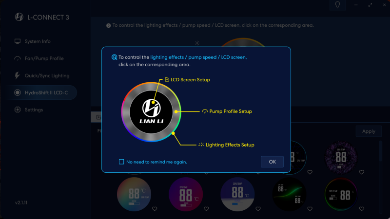 이 때 쿨링팬의 ARGB는 전혀 제어가 불가능 하며, 펌프 유닛의 배경 화면은 펌프의 링을 시계방향으로 회전시킬 때 마다 몇 가지 프리셋을 순환해 가며 수동으로 변경할 수 있으며, 반시계방향으로 회전 시 링 자체의 LED 색상과 모드를 수동 변경할 수 있습니다.
