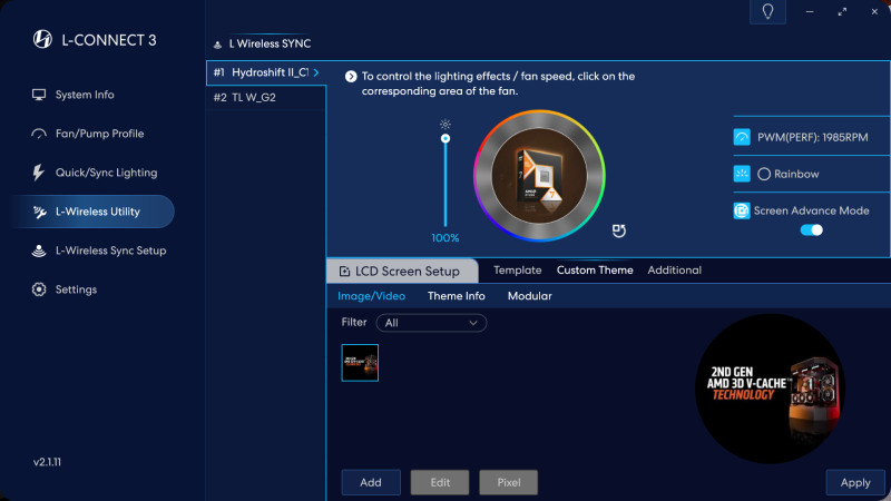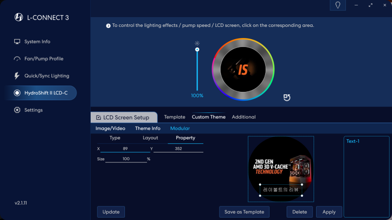 반면, 무선 동글을 연결하지 않고 라디에이터의 USB 2.0 커넥터만 연결한 경우에는 위 이미지처럼 영상 파일이나 이미지 파일을 직접 L-Conncet3 프로그램에서 로드하여 사용자 맞춤형 영상을 만들고 LCD에 직접 적용할 수 있습니다. 다양한 모니터링 값/사용자 지정 텍스트도 세부 조정을 포함해 화면에 적용해볼 수 있죠.