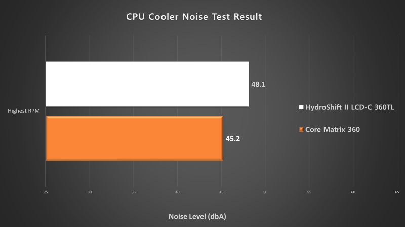다만, 최대 RPM으로 동작하는 경우의 소음은 48.1 dBA로 절대적인 소음은 다소 높은 것으로 평가할 수 있겠습니다. 펌프 소음은 최대 속도에서도 양호하고 특이 노이즈와 같은 불편함은 없었지만, 풍량과 풍압이 강력한 만큼 최대 속도에서의 팬 소음이 분명히 존재하니 이런 부분은 상세 튜닝을 통해 조절해 사용하는 것을 권장드립니다.