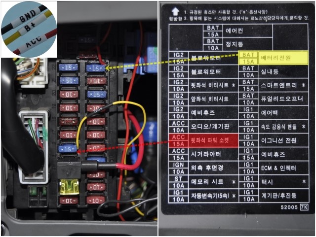 이 부분을 사용설명서에 표시하지 않은 이유는 차량에 따라 퓨즈박스 구조가 다르기 때문이며, 퓨즈자체에 배선을 연결