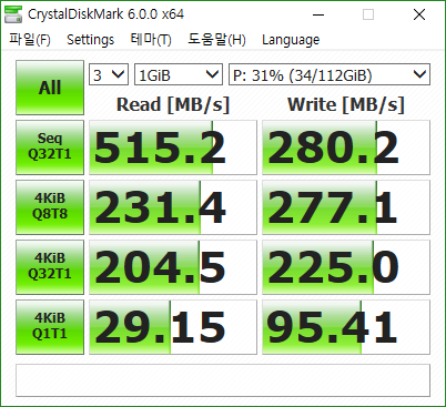 크리스탈 벤치마크에서 읽기 속도 515MB/s, 쓰기 속도 280MB/s의 결과값을 보여주며,