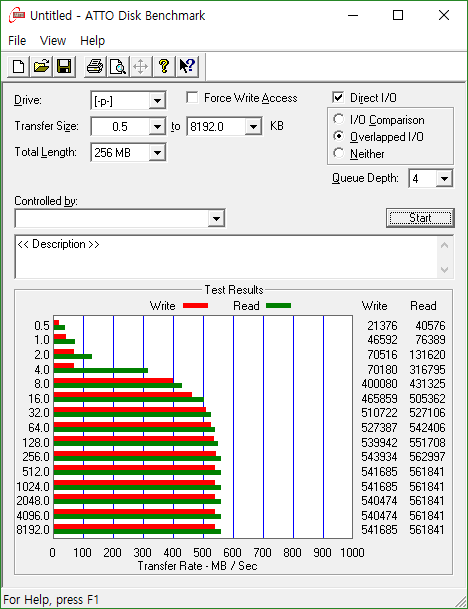 ATOTO 벤치마크에서는 읽기 속도 560MB/s, 쓰기속도 540MB/s로 제조사가 제공하는 스펙과 비슷한 수준의 결과를 보여줍니다.