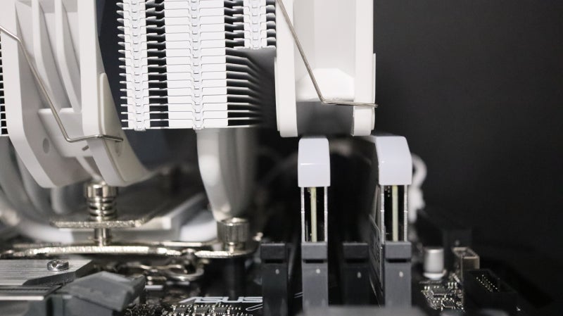 위와 같이 대장급 공랭쿨러를 위에 장착 하는 경우에도 쿨링팬이 거의 방열판을 벗어나지 않을 정도로 호환성이 준수합니다. 물론, 공랭쿨러도 괜찮지만 수랭쿨러와의 조합이 훨씬 좋은 튜닝램이라는 점은 기억해 주세요.