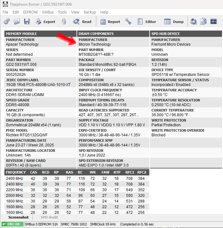 보다 자세한 정보를 볼 수 있는 타이푼버너를 사용해보니 칩은 마이크론의 불특정 다이를 사용한 것이 확인됩니다. 최근 마이크론의 크루셜 브랜드 제품군은 글로벌한 메모리 공급량 부족으로 인해 제품 출시를 단종했다는 소식이 들려 이제 일반 소비자들이 마이크론의 메모리를 만나볼 수 있는 방법은 이와 같은 어페이서 제품이 대안이 되겠습니다.