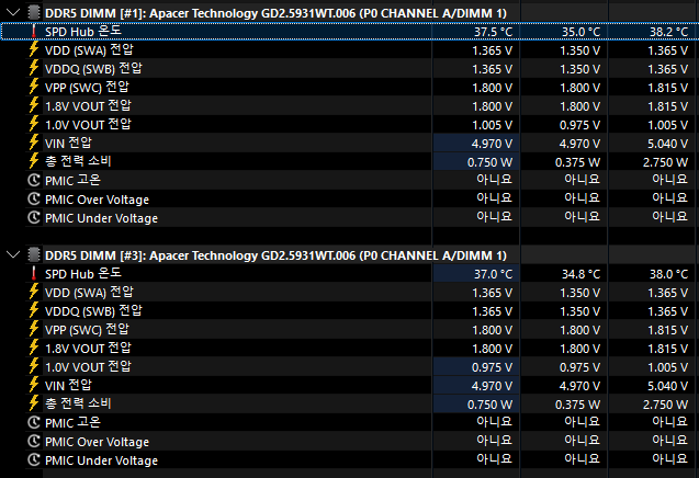 이 외에도 메모리에는 SPD HUB 온도를 확인할 수 있는 센서가 장착되어있음을 알 수 있습니다.