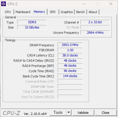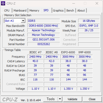 제가 사용하는 Ryzen AM5 시스템에서 윈도우즈에 진입 후 설정값이 잘 적용되었는지 확인해 봤습니다. 메모리의 EXPO 기준 스펙값이 잘 반영된 것을 볼 수 있네요. 최근엔 인텔 대비 성능/전력면 뿐 아니라 가격을 모두 고려해도 AMD의 라이젠 시스템이 추천되며 라이젠에서의 가장 좋은 메모리 궁합(핫스팟)이 6000MHz임을 감안하면 충분한 성능을 기대할 수 있겠습니다.
