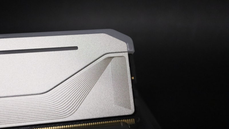 알루미늄 소재의 방열판은 양 면이 볼팅이 아닌 본딩(접착) 형태로 메모리와 방열판 끼리 결합된 구조를 통해 나사 홀 하나 없이 깔끔한 외모를 완성했네요. 방열판은 얇은 편에 속해 메모리 모듈의 무게도 가벼운 편이며 슬림하게 잘 빠졌습니다.