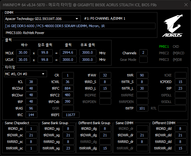 HWiNFO64 소프트웨어를 사용해 확인해본 메모리 정보입니다. EXPO(XMP) 설정 값이 잘 적용된 것이 확인되며 제한적이나마 PMIC 정보를 확인할 수 있네요.