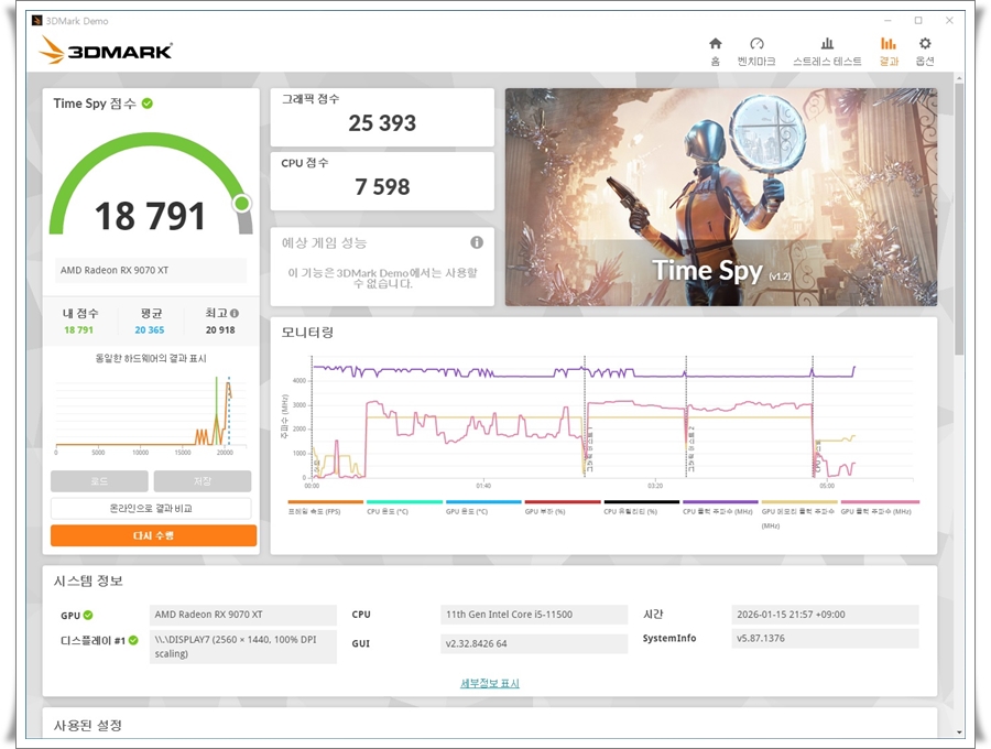 벤치 테스트시 살펴본 온도, 클럭, 소비전력, 팬RPM등을 측정해본 모습 입니다.