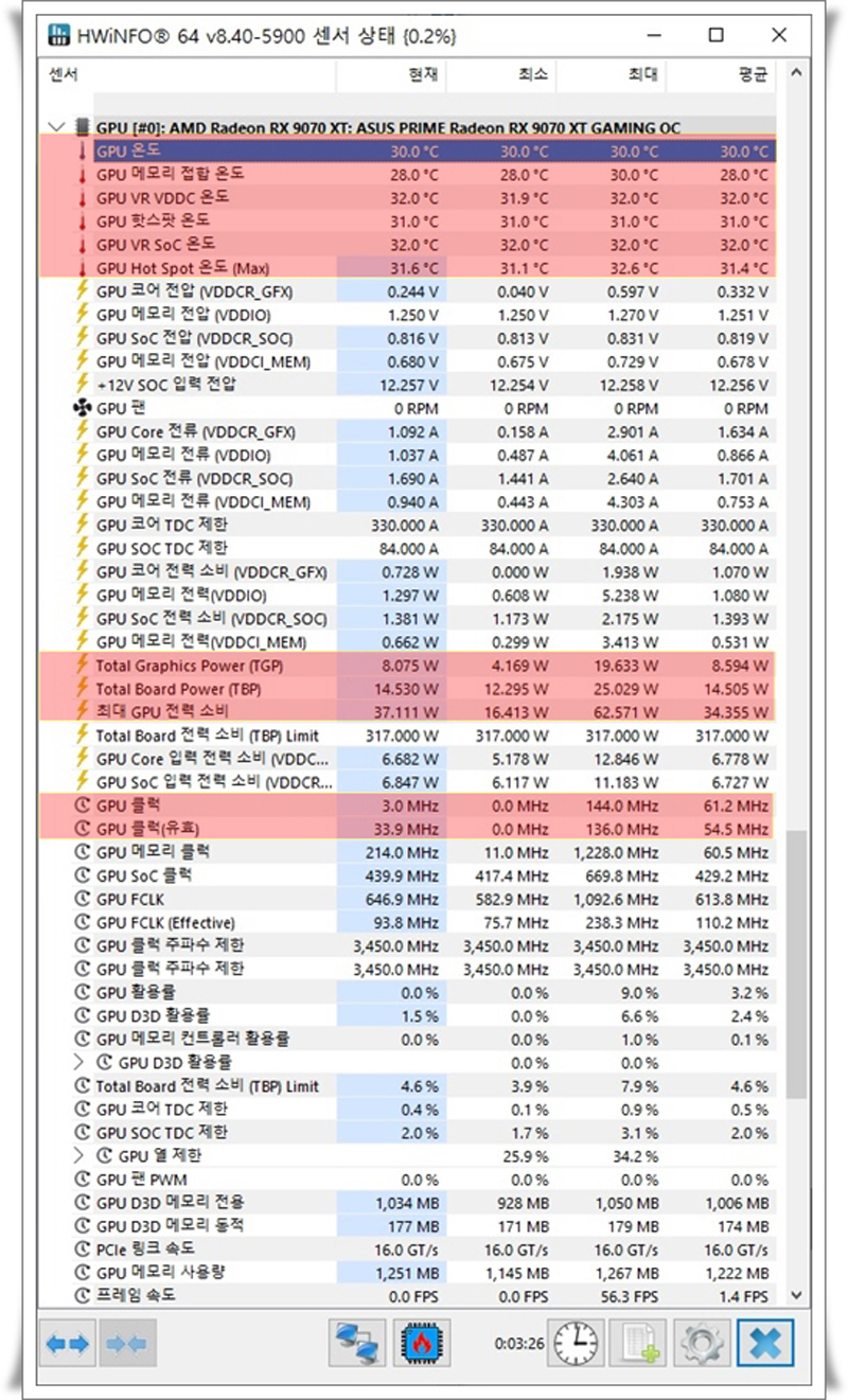 아이들시 살펴본 온도, 클럭, 소비전력, 팬RPM등을 측정해본 모습 입니다.