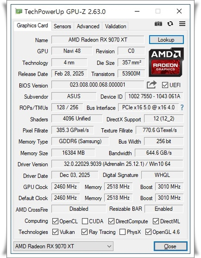 GPU-Z 유틸을 통해 살펴본 라데온 RX 9070 XT OC D6 16GB의 정보 입니다.