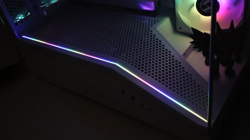 조립이 완료된 시스템의 모습입니다. ARGB가 많이 적용되어 있고 화이트 데스크테리어에 딱 맞는 제품이라 특히 이렇게 데스크 위에 올려두었을 때 매력적이네요. 메인보드의 ARGB 컨트롤러와 연동을 통해 전체 쿨링팬, 메모리, CPU 쿨러와의 조명 동기화도 연출할 수 있고요.