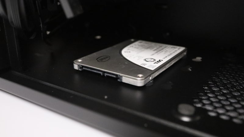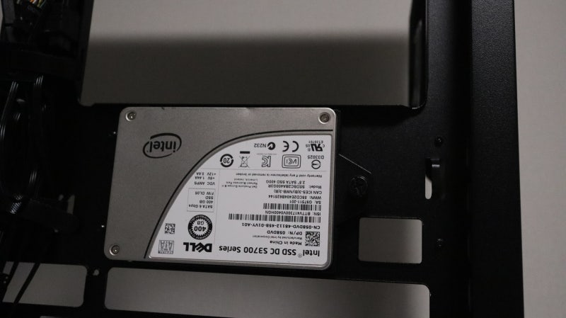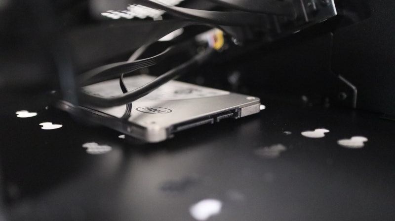 이어서 저장 장치 베이를 설명드릴 텐데요, 가장 기본이 되는 2.5인치 한 개가 측면에 배치되어 있습니다.