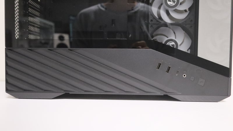 하지만 이 V100Mini는 다릅니다. 기존 V100에서 더욱 과감하게 크기를 줄여 미니타워에 가까운 크기로 컴팩트하게 설계된 베이스에 평범한 컨셉 충실한 모습인데, 그 아이덴티티를 잃기는 싫었는지 포인트로 하나를 케이스 하단에 남겨 두었네요.