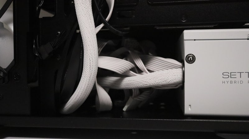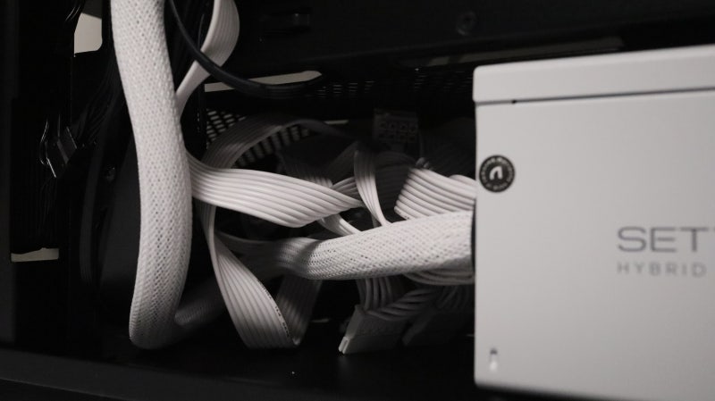 일반적인 파워를 사용해 조립해서 잔여 케이블이 많이 남은 상황이지만 저장장치만 없다면 이렇게 파워 앞 쪽 공간을 활용해 외부에 이 지저분한 케이블들이 노출되지 않도록 할 수 있습니다.