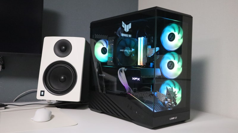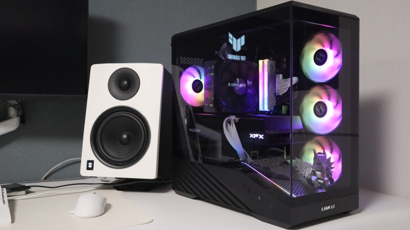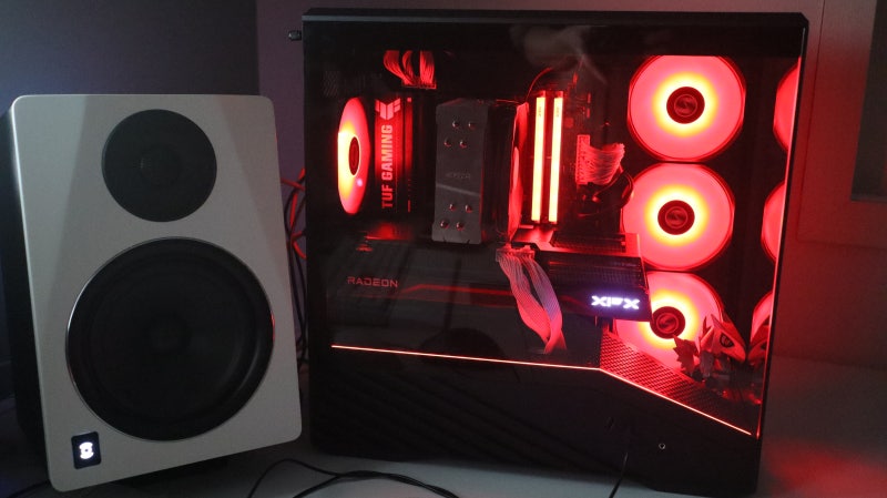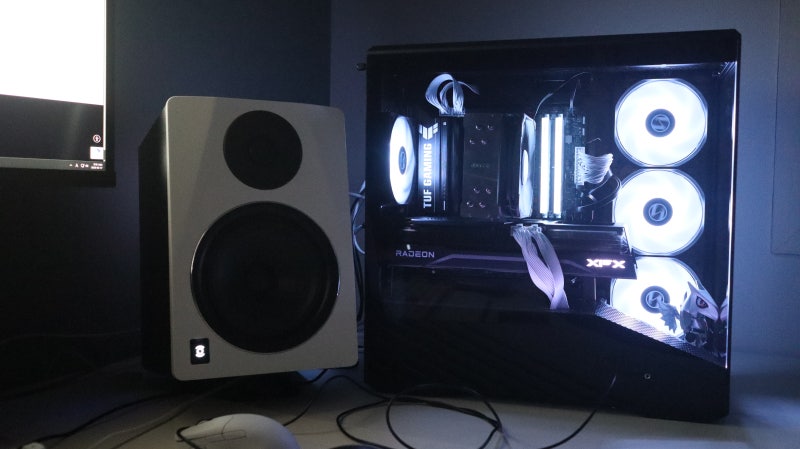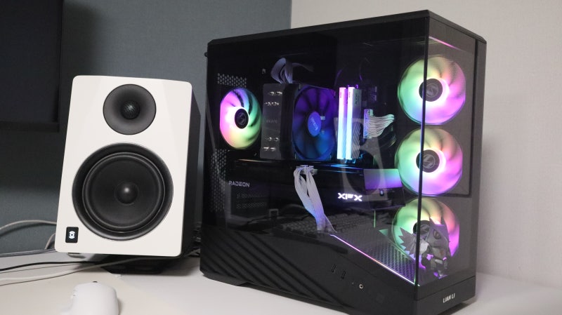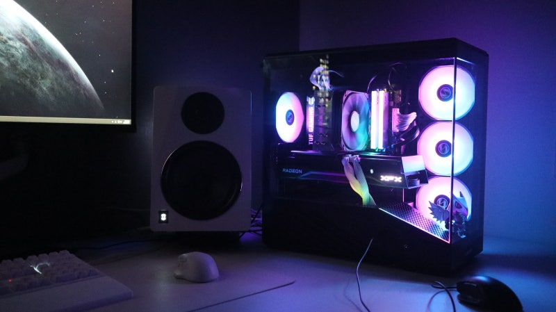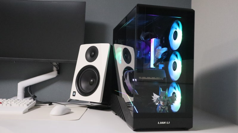 실제 조립을 완료하고 데스크에 배치한 모습입니다. 내부의 기본 팬과 CPU 쿨러, 메모리의 ARGB가 케이스를 넘어 데스크를 채우는 모습이 인상적입니다.