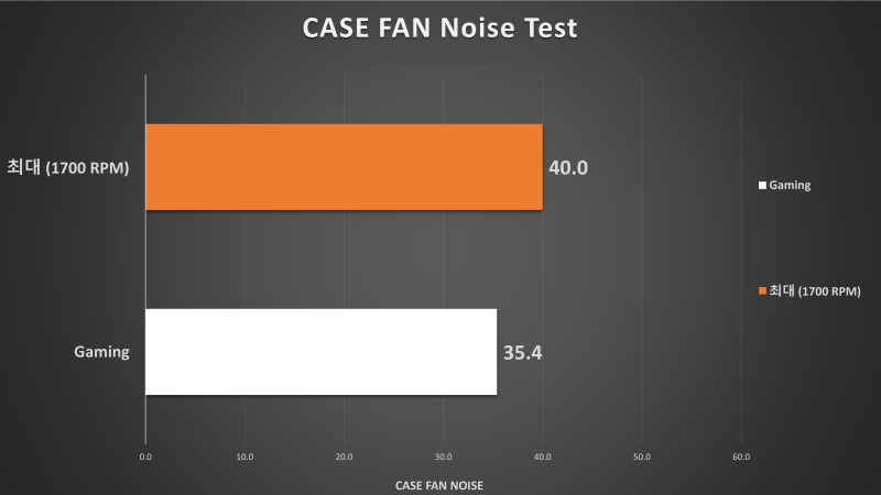 또한 강제로 기본 팬들을 최대 RPM으로 동작시킬 때도 너무 높지 않은 소음인 40dBA를 기록했으며, 일반적인 게이밍 환경(자동 제어 상태)에서는 35 데시벨로 쾌적한, 정숙한 소음 수준을 유지했습니다.
