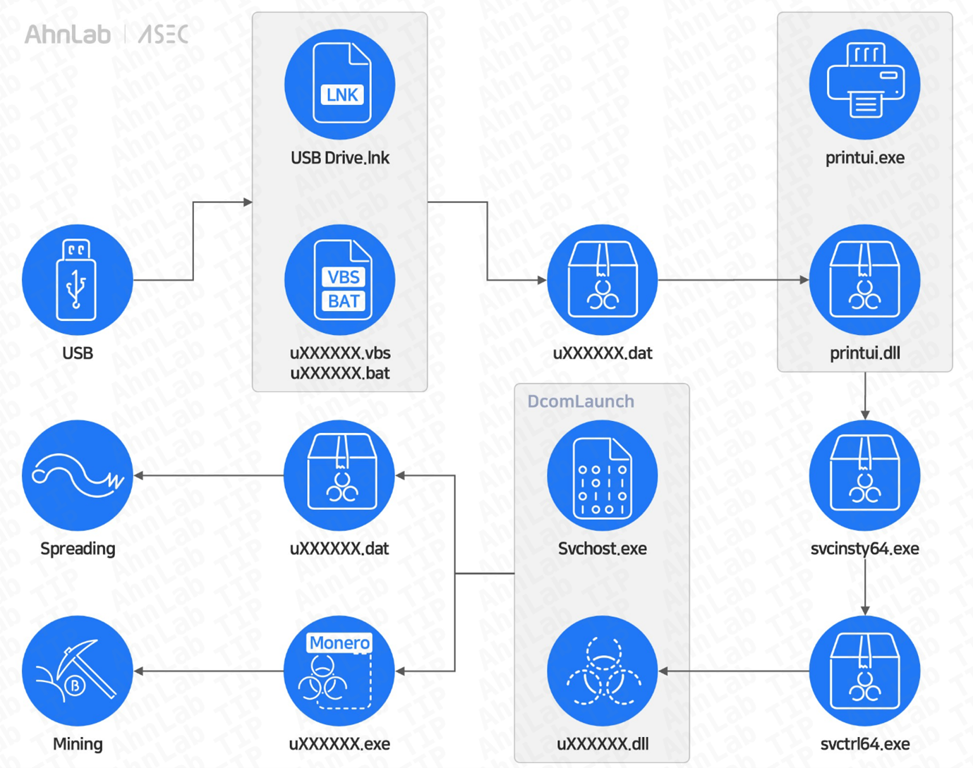 최근 국내에서 USB 저장장치를 매개로 전파되는 암호화폐 채굴 악성코드가 지속적으로 발견되고 있다. 전반적인 감염 흐름은 과거 USB 기반 공격과 유사하지만, 다단계 드로퍼 구조와 보안 제품 우회, 프로세스 은폐 등 한층 고도화된 기법이 함께 사용되고 있다. 이번 글에서는 이들 악성코드 중 최종 페이로드를 편의상 ‘PrintMiner’로 지칭하고, USB 전파 단계부터 최종 코인 마이너 실행까지의 최신 공격 흐름을 순차적으로 분석한다.