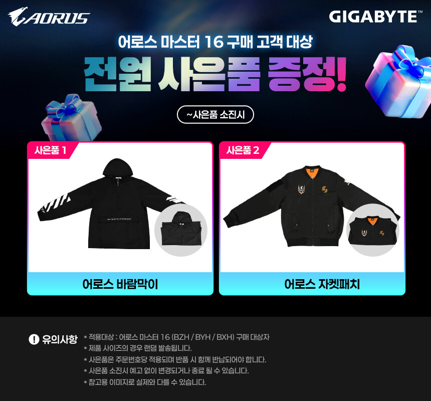 | 어로스 마스터 16 | Ultra 9 275HX | 지포스 RTX5090 | 어로스 바람막이 / 어로스 자켓패치 | 5만 원 |
