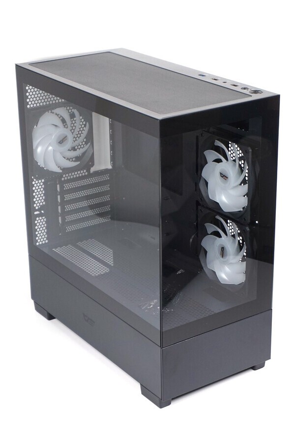 DS500M RGB에 적용된 전면 및 측면 강화유리는 내부를 과도하게 노출하지 않는 은은한 스모키 톤을 띠고 있어, RGB 조명과 하드웨어 실루엣이 부드럽게 투과되는 것이 특징이다. 완전 투명 유리 대비 반사와 시선 집중을 적절히 억제해 주며, 조명이 켜졌을 때는 튜닝 효과를 살리고 꺼졌을 때는 차분한 외형을 유지한다.