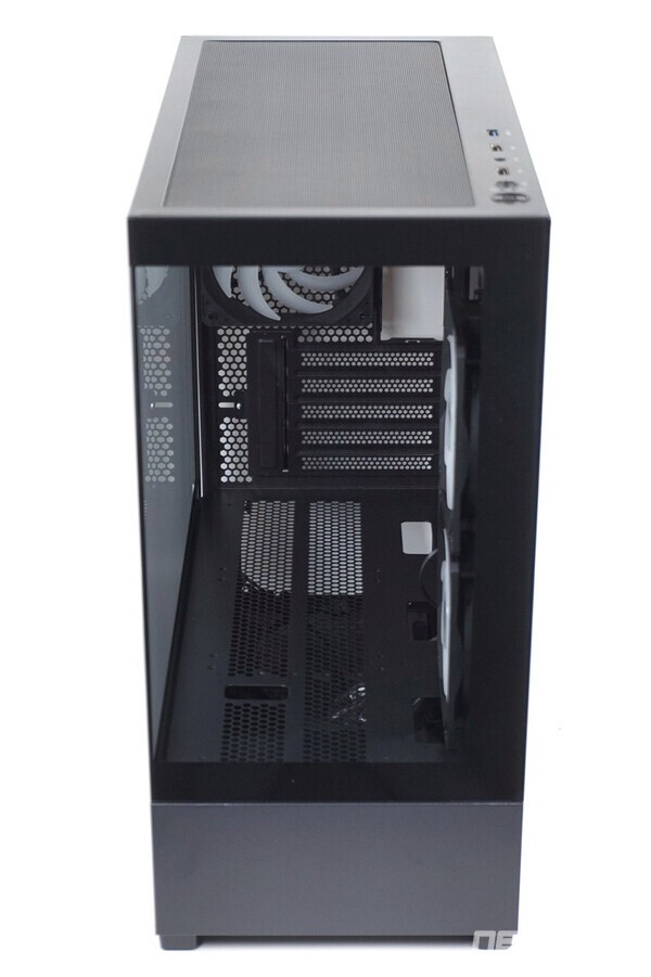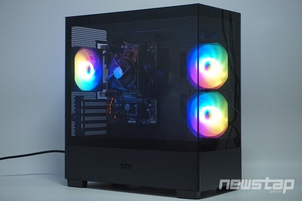 팬 2열이 앞쪽 측면에 수직으로 배치된 점도 외형의 핵심 포인트다. 강화유리에 의해 팬 자체가 마치 전시물처럼 전면에 드러나며, 팬 블레이드·테두리 구조·프레임 형상이 그대로 보이는 쇼케이스형 구성이 시각적 존재감을 크게 키운다. 이 덕분에 RGB팬의 조명 표현력은 더욱 강화되며, 균형 잡힌 메카닉 톤으로 깔끔하게 정돈된 인상을 준다.