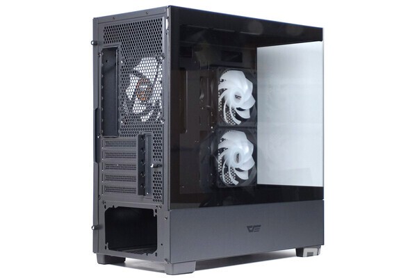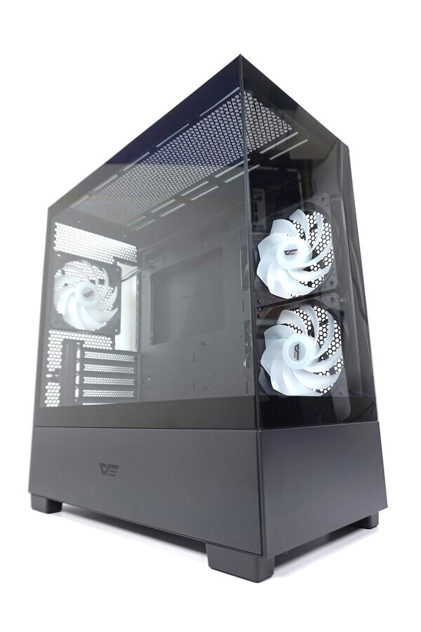 darkFlash DS500M RGB의 외형은 최근 PC 케이스 디자인 트렌드를 충실히 반영한 전형적인 어항형 구조를 기반으로 한다. 전면과 측면을 하나의 면처럼 연결한 파노라믹 2면 강화유리 디자인을 적용해, 내부 시스템이 시각적으로 끊김 없이 드러나는 것이 가장 큰 특징이다. 유리는 과도하게 돌출되지 않고 프레임과 자연스럽게 맞물려 있어 전체적인 인상이 깔끔하며, 각 모서리의 직선 위주 설계가 미니타워 특유의 단정한 비례감을 강조한다. 하단부는 강화유리 영역과 분리된 솔리드 패널 구조로 구성돼 시각적 안정감을 더하고, 내부 파워서플라이 및 케이블 영역을 자연스럽게 가려준다.