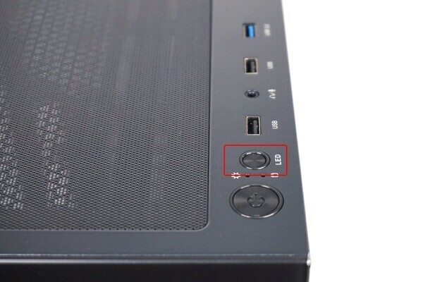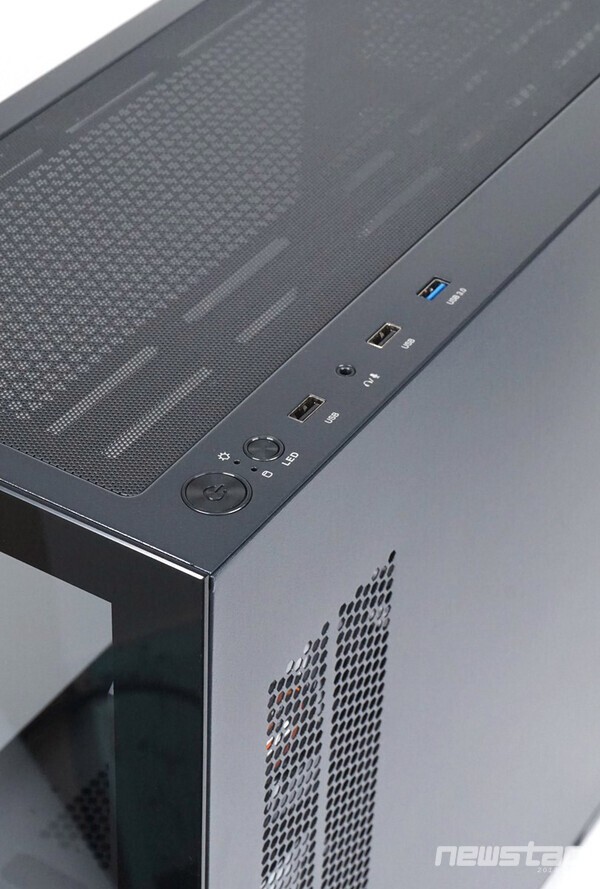 DS500M RGB의 상단 I/O는 데스크톱 환경에서 가장 자주 쓰는 포트를 전면이 아닌 상단으로 끌어올려, 접근성을 우선한 구성이라는 점이 특징이다. 상단에는 전원 버튼과 함께 LED 버튼(리셋 버튼)이 배치돼 있어, 시스템 전원 제어와 RGB(또는 팬 모드) 변경을 손이 닿는 위치에서 빠르게 수행할 수 있다. 또한 상태 표시를 위한 Power LED/HDD LED가 함께 마련돼, 튜닝을 위한 조명 연출과 별개로 기본적인 사용 편의도 챙겼다.
