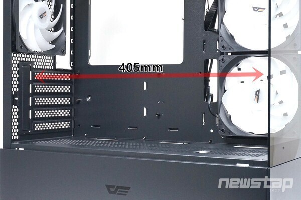 내부 부품 호환성에서도 최신 하이엔드 시스템 구성을 충분히 고려한 구조를 갖췄다. 미니타워급 케이스인만큼 메인보드는 ATX가 아닌 M-ATX, ITX 규격을 지원한다. M-ATX 환경에서도 게이밍·크리에이터 환경 등 다양한 목적에 맞는 빌드 구성이 가능하므로 문제는 없다. 후면 PCI 슬롯도 M-ATX 규격에 맞춰 5개로 구성했다.