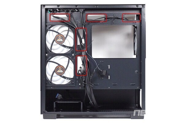 DS500M RGB는 내부 조립 완성도를 좌우하는 케이블 정리 부분에서도 어항형 케이스에 요구되는 요소를 충실히 반영했다. 메인보드 트레이 전반에 걸쳐 충분한 크기의 케이블 정리 홀이 기본 설계로 배치돼 있어, 메인 전원 케이블과 CPU 보조전원, 그래픽카드 전원, SATA 케이블 등을 각 위치에 맞게 자연스럽게 분산시킬 수 있다. 홀의 위치가 메인보드 장착부와 팬 영역을 기준으로 정리돼 있어, 조립 과정에서 케이블을 무리하게 꺾거나 우회할 필요가 없다는 점도 장점이다.