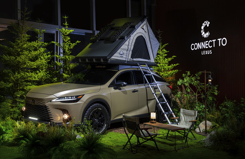 ‘RX 아웃도어 콘셉트’는 플러그인 하이브리드 모델인 RX 450h+를 베이스로 하이브리드와 EV 주행으로 CO2 배출량을 저감해 탄소중립에 공헌함과 동시에 고품질 주행성능을 제공한다. 또한 아웃도어의 거친 노면 주행에 뛰어난 대구경 전지형 타이어와 별도의 텐트를 설치하지 않아도 캠핑을 즐길 수 있도록 루프탑 텐트를 탑재했다.