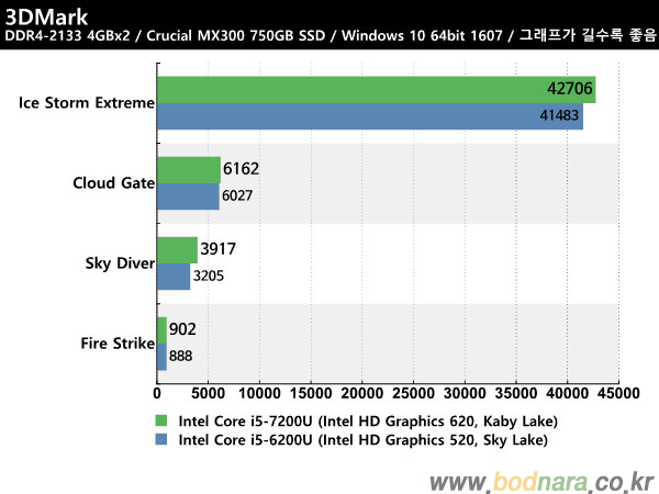 7세대 카비레이크 기반 코어 i5-7200U의 CPU 성능은 클럭 변화에 의한 것으로 생각되는 반면 내장 그래픽(인텔 HD 그래픽스 620)의 변화는 아쉽게도 인텔 베타 드라이버로 인해 확실한 테스트가 어려웠다. 3DMark 테스트 결과 CPU 클럭 향상으로 인한 Physics 점수와 그래픽 점수가 합쳐져 전체 점수에서는 코어 i7-7200U의 결과가 높지만 실제 그래픽 테스트 초당 평균 프레임(FPS) 기준으로 보면 낮은 프레임에서 1프레임 안팎의 차이여서 실제 게임에서는 체감하기 어려울 것으로 생각된다.