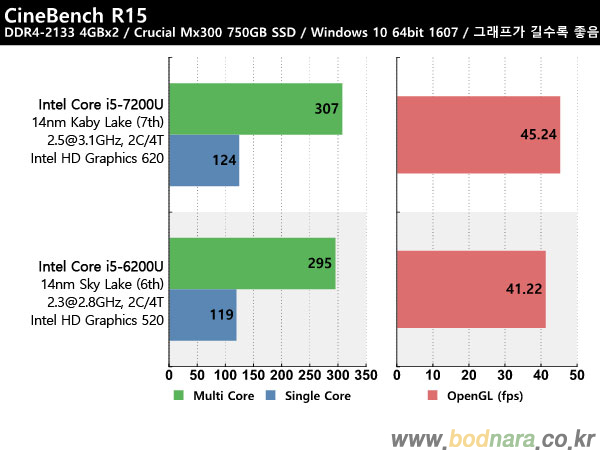 프로세서 성능 비교에 자주 사용하는 CineBench R15 테스트 결과를 보면 카비레이크 코어 i5-7200U와 스카이레이크 코어 i5-6200U는 CPU 동작 클럭에 따른 정도의 성능 차이를 보여주는 것을 확인할 수 있다. GPU(OpenGL) 성능에서도 10% 정도의 향상을 보였는데 CPU 클럭 상승 및 드라이버 차이에 의한 것일 가능성이 높다.