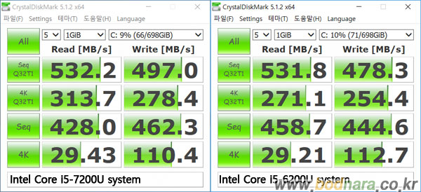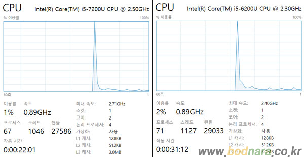 이미 유출된 자료를 통해 7세대 카비레이크는 기존 스카이레이크 프로세서에서 동작 클럭을 높여 성능을 10% 이상 향상시킨 것으로 알려지고 있다. 보드나라에서는 카비레이크 코어 i5-7200U와 동급의 이전 세대 모델인 스카이레이크 기반 6세대 코어 i5-6200U 프로세서가 들어가는 시스템을 구해 두 프로세서의 성능을 비교해보았다. 테스트에 사용한 메모리와 스토리지(SSD), 메인보드 칩셋, 운영체제 등은 동일하지만, 카비레이크 쪽은 정식 출시되지 않은 테스트 시스템에 베타 드라이버를 사용했으므로 실제 성능은 이와 차이가 날 수 있음을 미리 밝혀둔다.