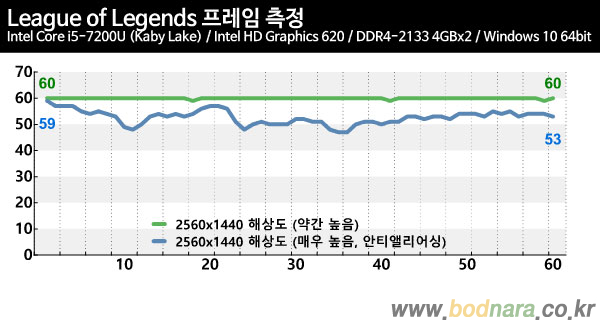 다른 그래픽 드라이버가 없어 게임 성능은 제대로 측정하지 못했지만 3DMark와 LoL 결과로 미루어 볼 때 기존 스카이레이크 코어 i5-6200U에 들어갔던 인텔 HD 그래픽스 520에서 소폭 증가한 성능을 보여줄 것으로 예상된다.